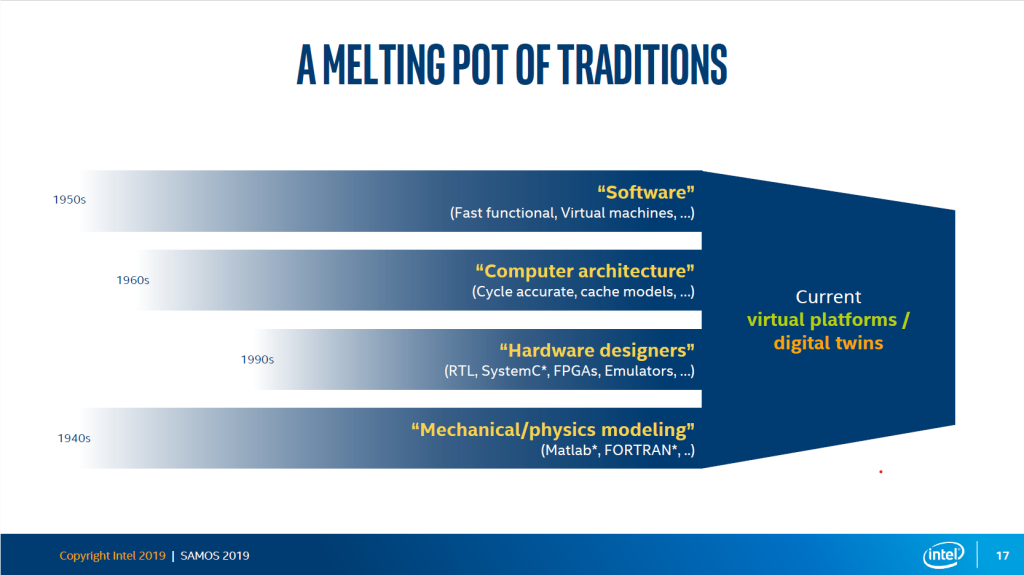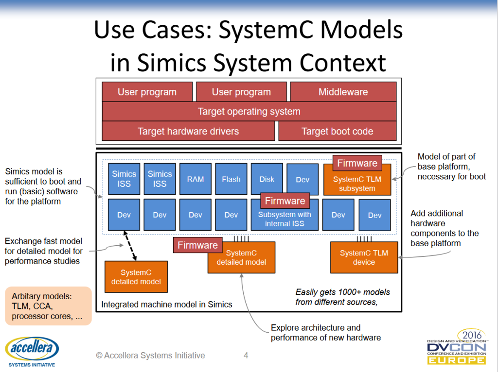 In addition, the Simics models were being extended with models from internal hardware design teams. These models would be integrated into an overall platform to get firmware running within the complete system software stack. As expected, many of these models would be quite detailed and thus slow, but they were there. And they might be built using tools that would be considered “EDA” – like SystemC.