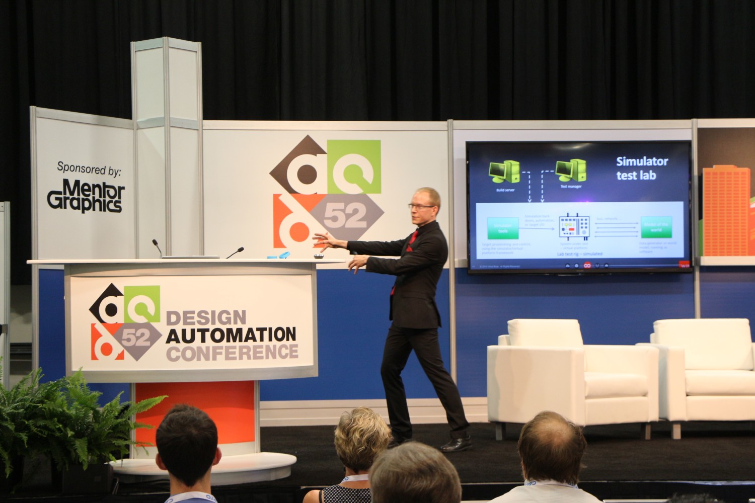 In 2015, I attended the DAC again. At this point, Simics had been acquired by Intel and us sales and marketing people were at Wind River. The DAC was expanding beyond RTL to pick the Systems and Software angle, and we got a good slot to present a SKYTalk in the main exhibition hall. So here I am, talking virtual platforms for embedded systems at the DAC. Pure virtual platforms for software development, nothing at all about hardware design or validation:
