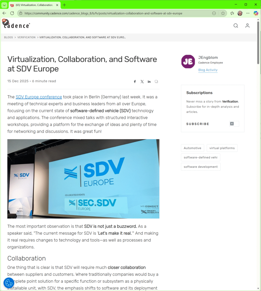 I have now posted my first blog post in the Cadence Community. It was just a matter of time after the VLAB team got acquired by Cadence earlier in 2025 I guess. The topic is the SDV Europe conference that happened in the first few days of December 2025.